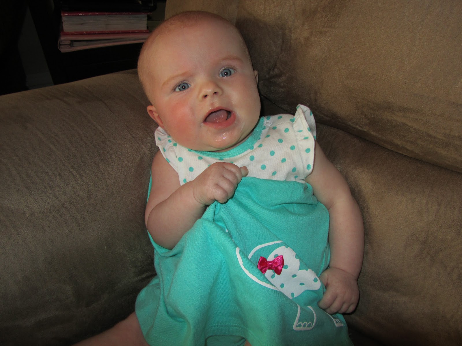 Lindsay is 5 months old as of Saturday! I can't believe how fast time is flying with her! I can't believe next month she will be 1/2 a year! She's growing up too quickly! I think she is getting really fun though! On her 4 month birthday she rolled from her back to her tummy so over the last month she has practiced. She can easily flip from her tummy to back but is still working hard to conquer the back to tummy. She loves playing on her side though. She's also getting really good about twisting and turning and grabbing things! She is so flexible! I think she may be our little athlete/gymnast! She is really getting a personality too! She's oh so sweet! She has her moments when she's tired or hungry but for the most part she rolls with the punches whatever that may be! So far I can tell a BIG difference in her and Colby. Colby was a great baby too but he was very used to his routine and didn't do well when being taken out of it so far she seems to do fine. Her naps have gotton so much better too! We had to do a little crying it out and I've discovered just not going in there and letting her fuss for a bit has helped so much! She has learned to put herself to sleep and not depend on comfort from me. We still swaddle her at night but she always breaks out now but it doesn't wake her up anymore which is nice! She is taking one 2-3 hour nap after lunch most days. She also takes a 30-40 min catnap in the morning usually while we are out and about and then a 30-40 min catnap in the afternoons/evenings either in her swing or me rocking her. She is sleeping great still at night. She goes to bed around 8 and sleeps until 7:45-8 the next morning. She's eating great. She is doing 6 oz five times a day. Since her 4 month b-day she began eating cereal twice a day and we have just added veggies twice a day also. So now she is on a 3 meal a day schedule. She has oatmeal for breakfast, a veggie for lunch, then rice cereal mixed with a veggie for dinner. This is the same way we did it for Colby which made it really easy to get him used to our eating times. So far she is loving the veggies. She seems to really have gotton more into it the last couple of days there for awhile she would eat her cereal but wasn't thrilled. Now she laps it up! I think she finally figured out it was food! So far she has had peas, squash, green beans, and carrots. I want to make some baby food for her I just honestly haven't had the time. I am not patient enough to make it all but I do hope to try to do some homemade stuff for her. She is still petite. I would guess she weighs around 14 lbs? She is wearing a size 2 diaper. She wears 6 month clothes or 3-6 month depending on the brand. She loves tummy time and acts like she wants to crawl! i think she will be mobile quicker then Colby. She already can move around by rolling/scooting which I don't think he did until 7 or 8 months! She's a sweetheart and we are so happy to have had her in our lives for 5 months can't wait to see her grow into a little girl!